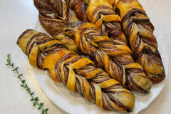 生地を軽く伸ばし短めの棒状にしていく。六つ全部棒状になったところで、今度は45cm程度の長さに伸ばし、コルネ型に5巻程度で巻く。二次発酵の時膨らむことを想定して、巻くときに少し隙間を開けておく。