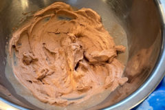 最後に薄力粉とベーキングパウダーを振るいながら入れて、粉が飛び散るのを気をつけながら混ぜていけば、かなりねっとりとしたケーキ生地が出来上がります😊 -