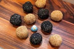 パン生地にクリームチーズを包み終わったら、天板にとじ目を下にして並べていきましょう。今回は8個のダッチブレッドを作るので、天板は二枚使用しました。そのうちの一枚は写真の様に上掛け生地の器を天板に乗せています。全ての生地を天板に並べ終わったら、30℃40分で二次発酵。結構膨らむので、パン生地同士だけなく天板とパン生地の間もちゃんと開けておいた方が良いと思います😉 -