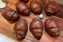 模様を入れ終わったら、天板に並べていきましょう。パン生地一つずつ具材をいれて、閉じて、模様をつけて天板に並べるという作業を8個分繰り返すと、結構時間が掛かります。時間が掛かると最初の一個目の発酵が進み、すでにフォーク模様が消え始めていることがあるので、全てのパン生地を天板に並べ終わったら、もう一度念のためフォークを押し付けて模様をしっかりつけておきましょう☝ -
