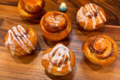 一次発酵終わればガス抜きをして8つに切り分け、固く絞った濡れふきんをかぶせベンチタイム10分。できるだけ同じパン生地の同じ重さになるように丁寧に切り分けましょう☝