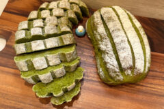 余熱をしている間に軽く霧吹きで水をふいたあと、強力粉をふるい、パン生地に十字にハサミで切り込みをいれます。今回は中のさつまいもの甘露煮が見えるまでしっかりと切り込みをいれてくださいね。
