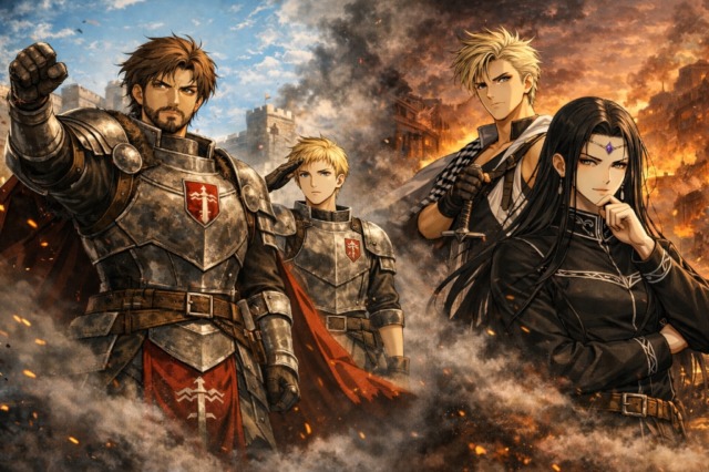 第49話 蜂起の狼煙 偽ヴィランが兵を翻弄し、民が決起。主の消えた領主館へ。空っぽの城へと向かう足音は、盤上の王手を告げる響きを帯びていた。 -