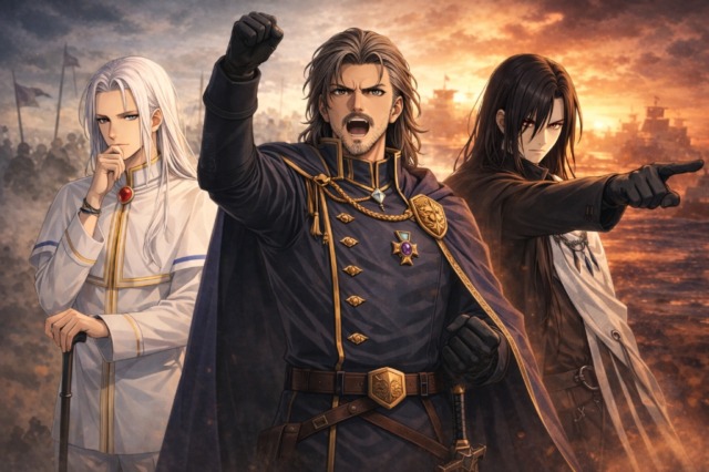 大公城の謁見の間。カリュースは姫奪還のため、ブラーム公に三万の派兵を請う。その無謀とも言える要求に対し、冷徹なる大公の懐刀「黒の軍師」ユロが牙を剥く。だが、ひざまずく「白髪の軍師」リーディスは静かに、そして鮮やかにその盤面をひっくり返した。